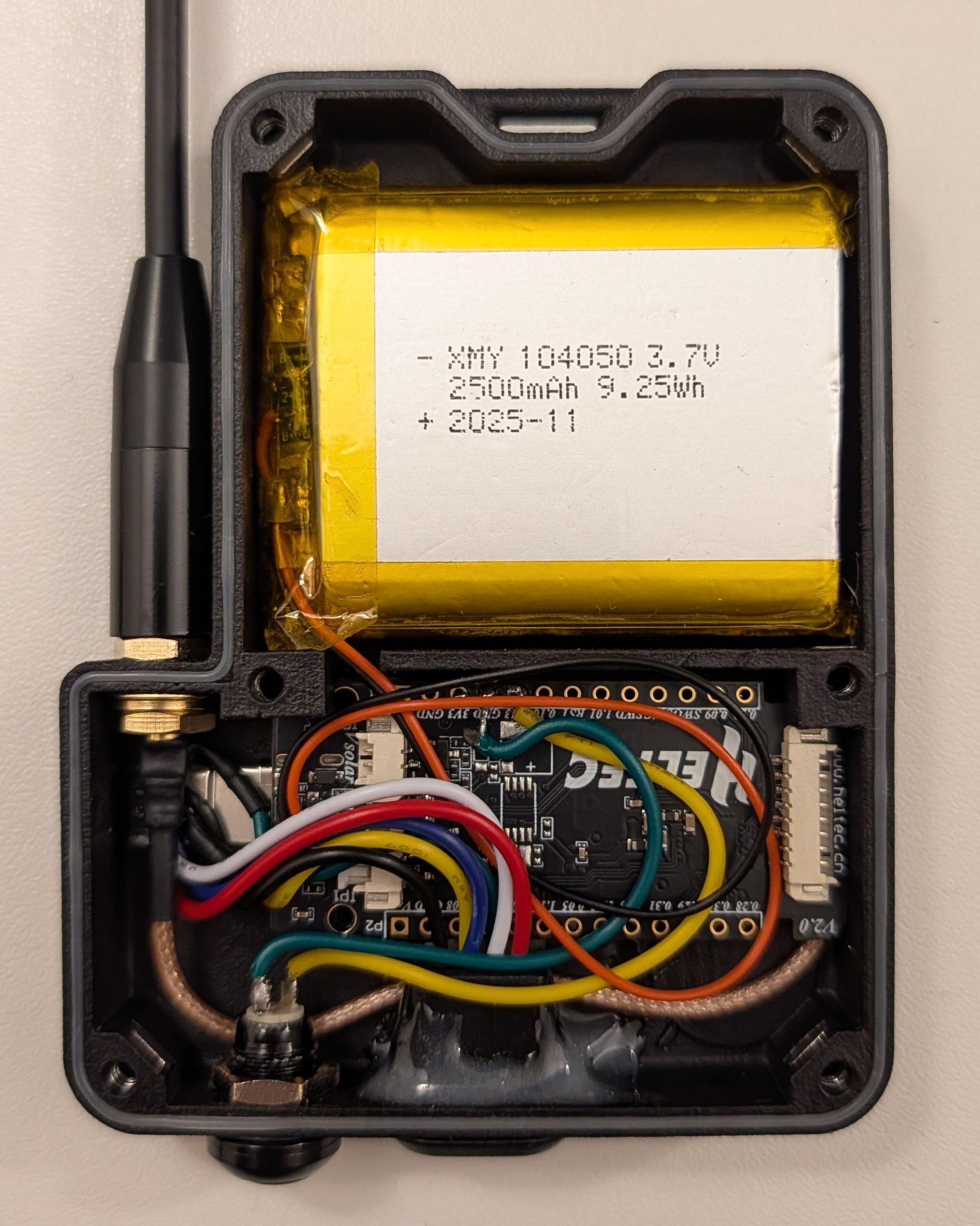 The finished enclosure weighs approximately 150g and provides solid protection for the device. With a 2500 mAh battery and the efficient nRF chip, the node can run for several days on a single charge. The external 10 dBi antenna should deliver excellent range for off-grid communication. To distinguish between two nodes, I added a gold-plated metal brooch. I look forward to testing the device on my next mountain hike.